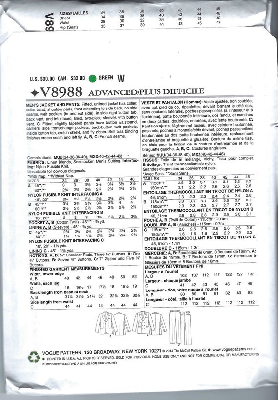 Uncut Vogue Sewing Pattern Men S Suit Jacket And Pants Etsy